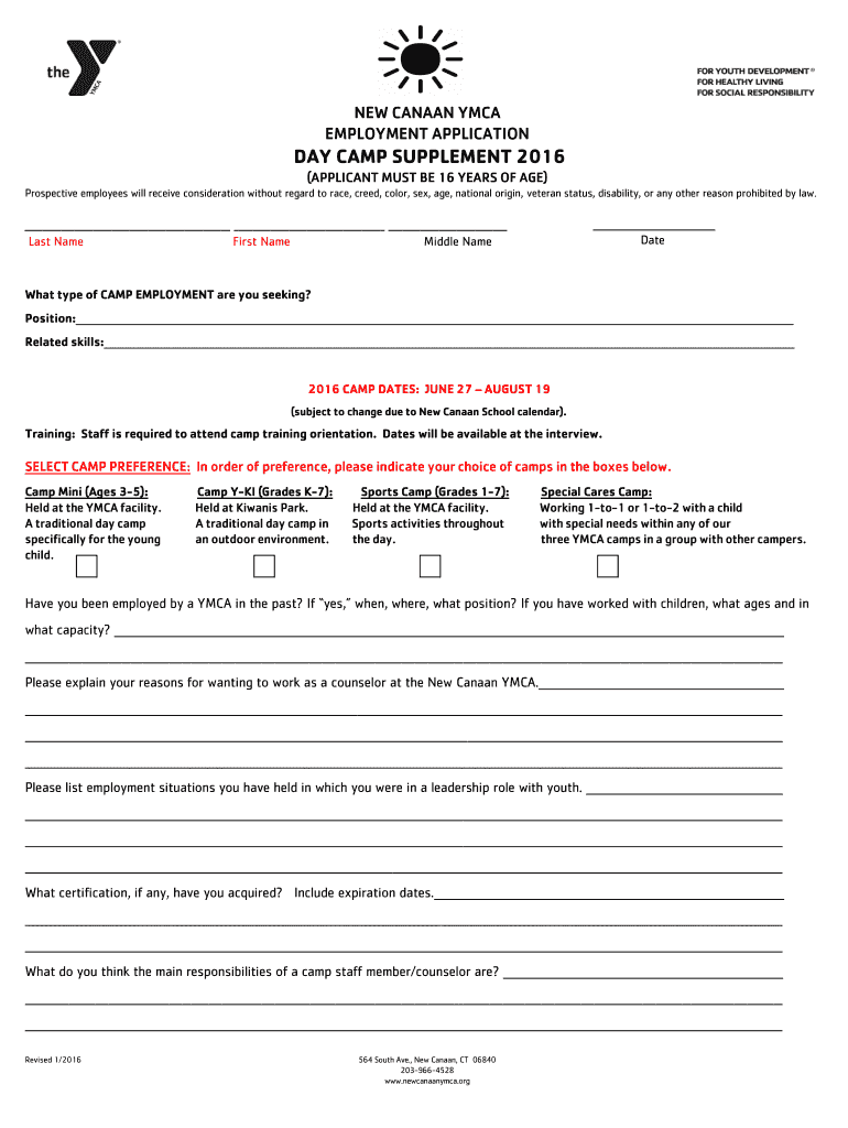 NEW CANAAN YMCA EMPLOYMENT APPLICATION DAY CAMP SUPPLEMENT 2016 (APPLICANT MUST BE 16 YEARS OF AGE) Prospective employees will receive consideration without regard to race, creed, color, sex, age,