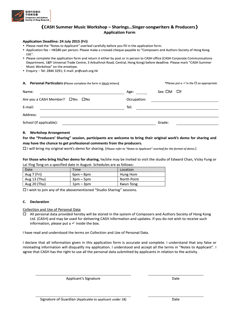 CASH Summer Music Workshop SharingsSingersongwriters & Producers Application Form Application Deadline: 24 July 2015 (Fri) Please read the Notes to Applicant overleaf carefully before you fill in