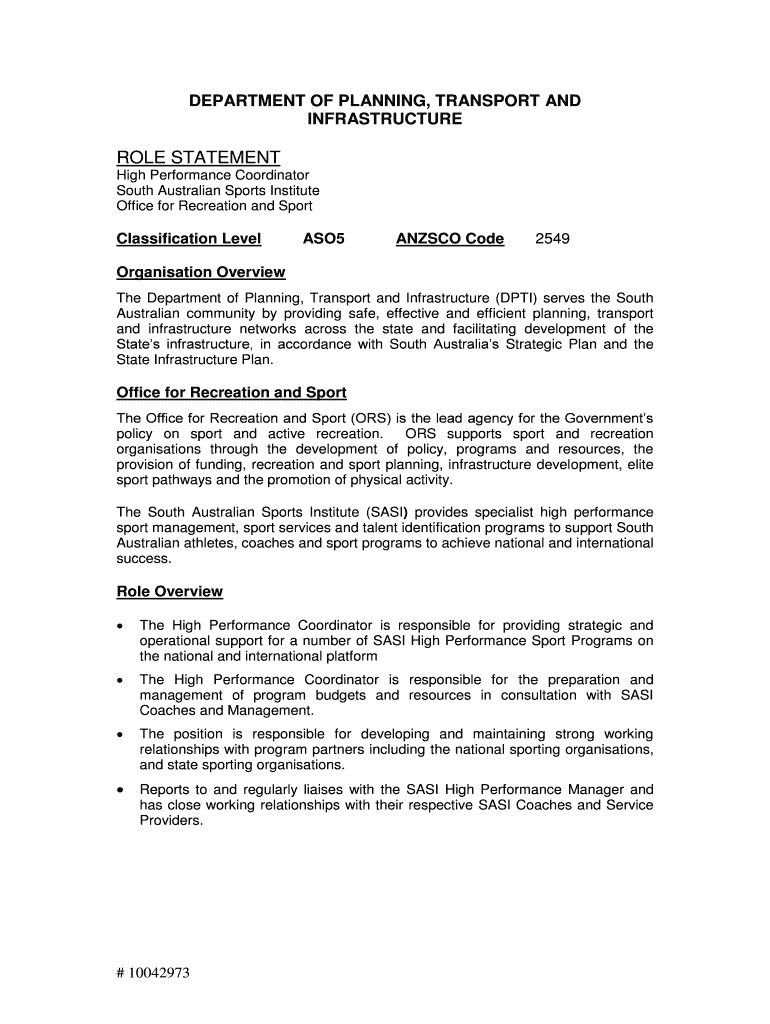 DEPARTMENT OF PLANNING, TRANSPORT AND INFRASTRUCTURE ROLE STATEMENT High Performance Coordinator South Australian Sports Institute Office for Recreation and Sport Classification Level ASO5 ANZ SCO