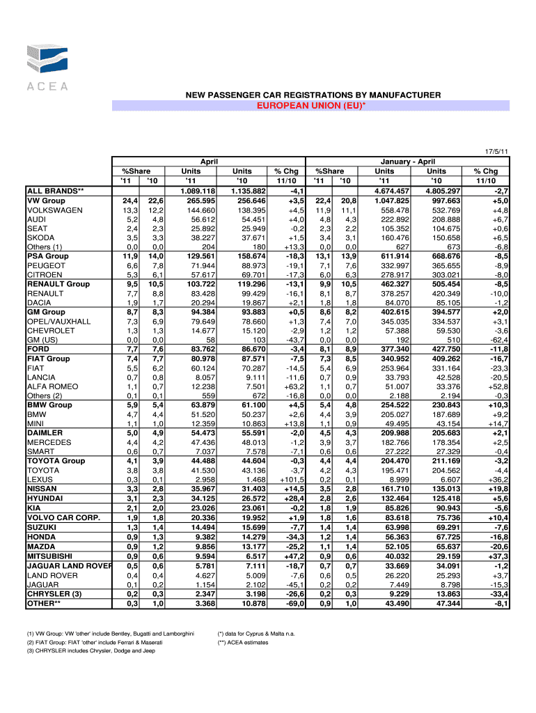P r e s s R e l e an s e PROVISIONAL NEW PASSENGER CAR REGISTRATIONS BY MANUFACTURER EUROPEAN UNION (EU)* 17/5/11 share '11 '10 ALL BRANDS** VW Group VOLKSWAGEN AUDI SEAT Škoda Others (1) PSA Group
