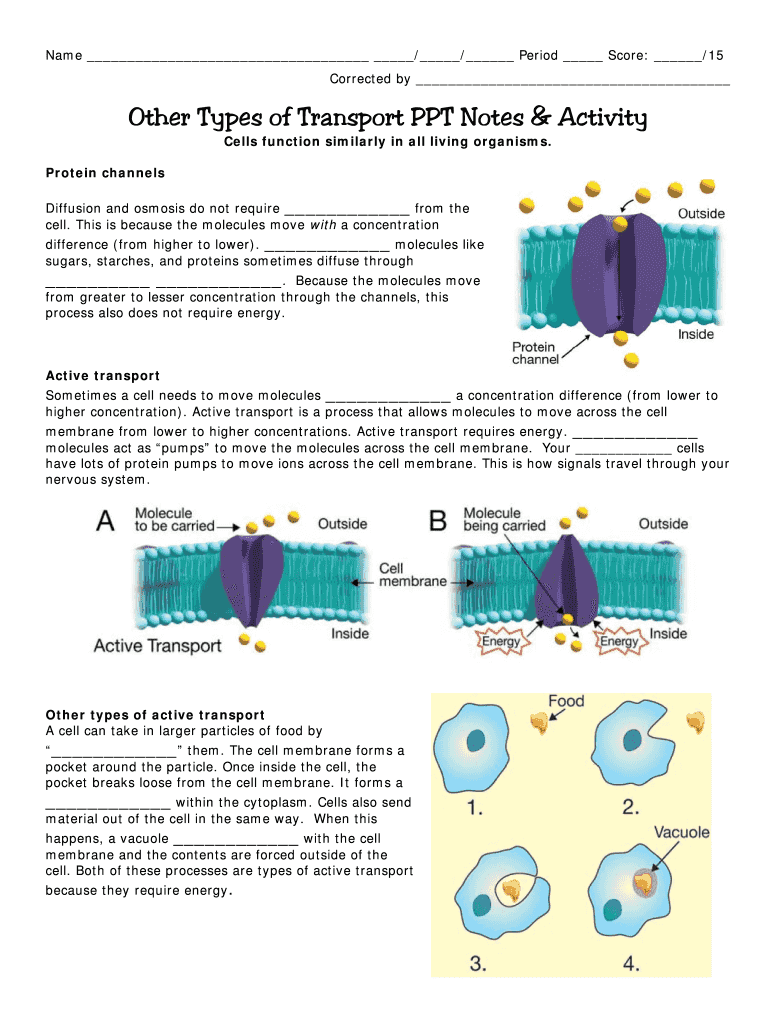 Name / / Period Score: /15 Corrected by Other Types of Transport PPT Notes & Activity Cells function similarly in all living organisms. Protein channels Diffusion and osmosis do not require from the