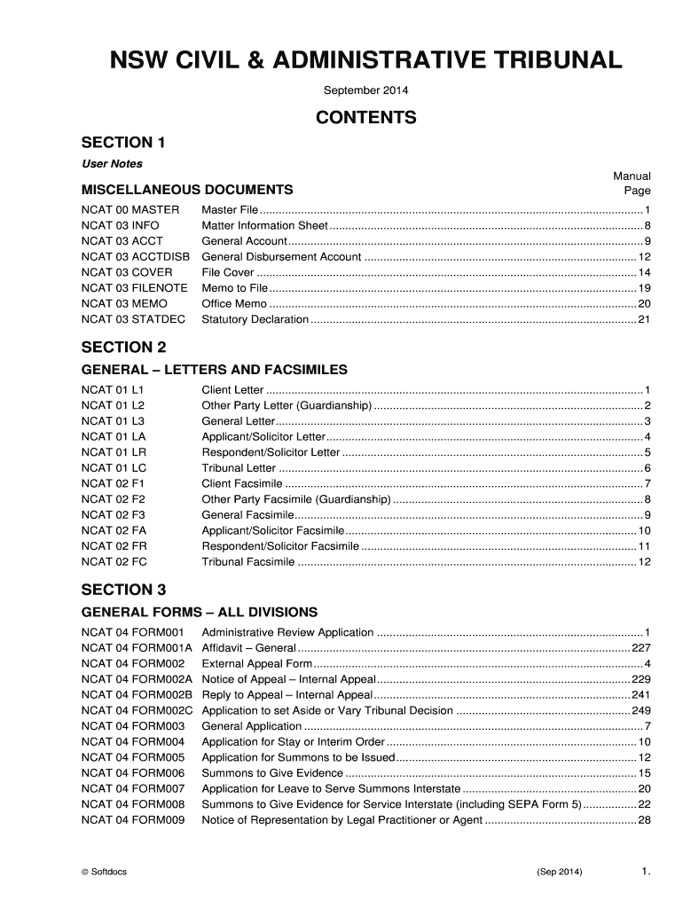 NSW CIVIL & ADMINISTRATIVE TRIBUNAL September 2014CONTENTS SECTION 1 User Notes Manual PageMISCELLANEOUS DOCUMENTS NCAA 00 MASTER NCAA 03 INFO NCAA 03 ACCT NCAA 03 ACCEDING NCAA 03 COVER NCAA 03 FILENAME