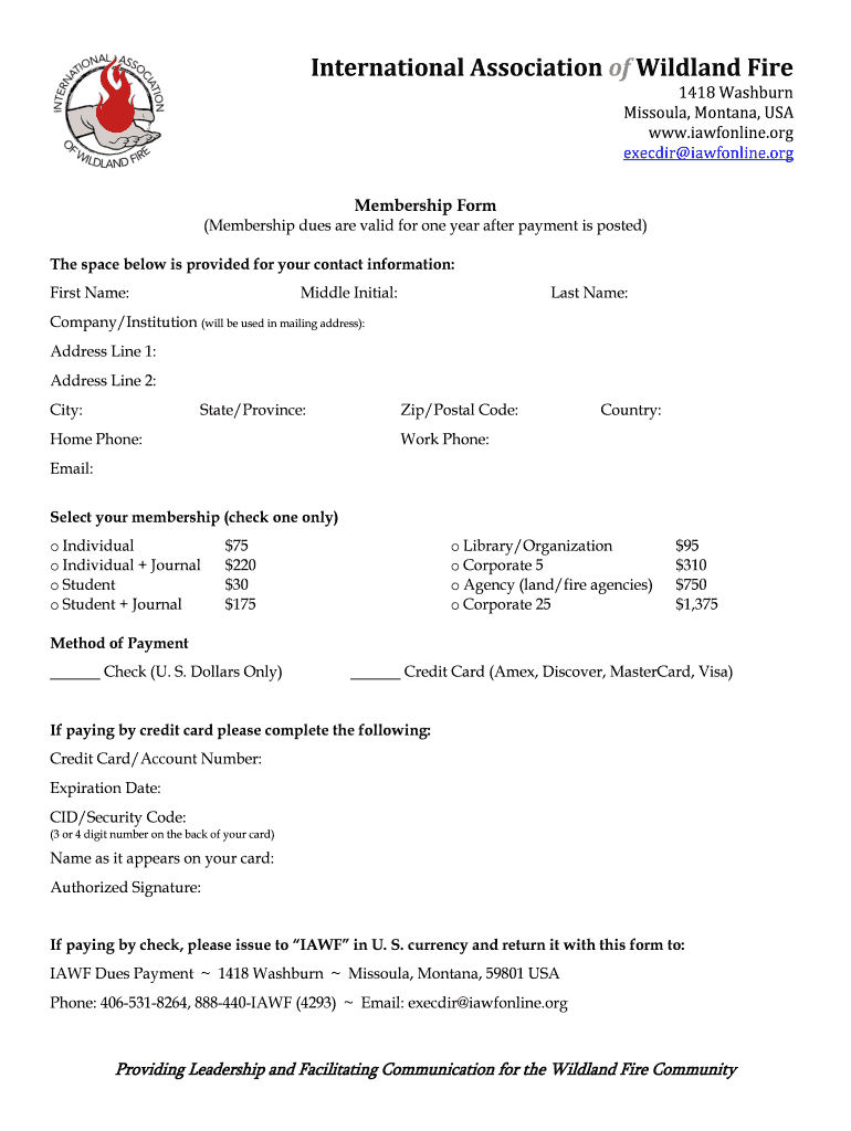 International Association of Wild land Fire 1418 Washburn Missoula, Montana, USA www.iawfonline.org execute iawfonline.org Membership Form (Membership dues are valid for one year after payment is