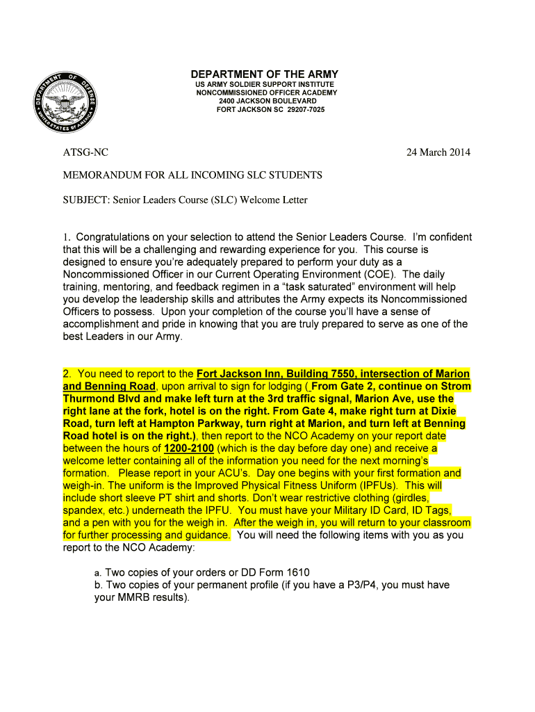 FORT JACKSON SC 292077025ATSGNC24 March 2014MEMORANDUM FOR ALL INCOMING SLC STUDENTS