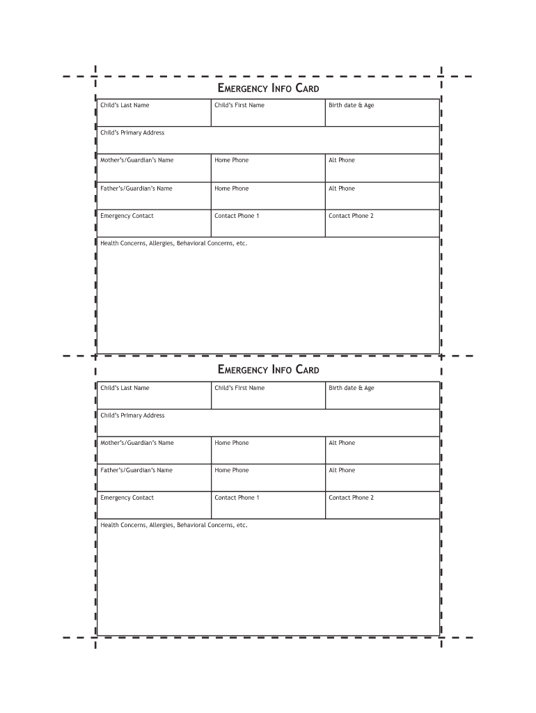 This document serves to collect essential information about a child for emergencies, including personal details, contact information, and health concerns.