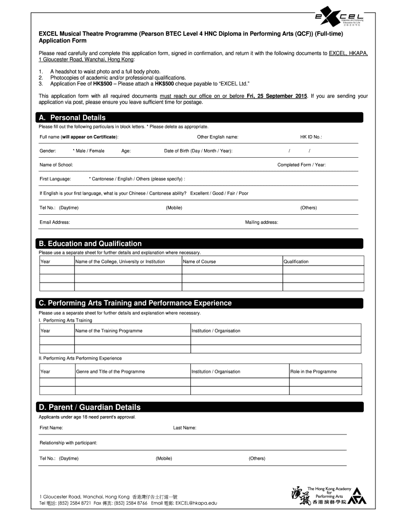 EXCEL Musical Theater Program (Pearson BTEC Level 4 HOC Diploma in Performing Arts (CF)) (Full time) Application Form Please read carefully and complete this application form, signed in confirmation,