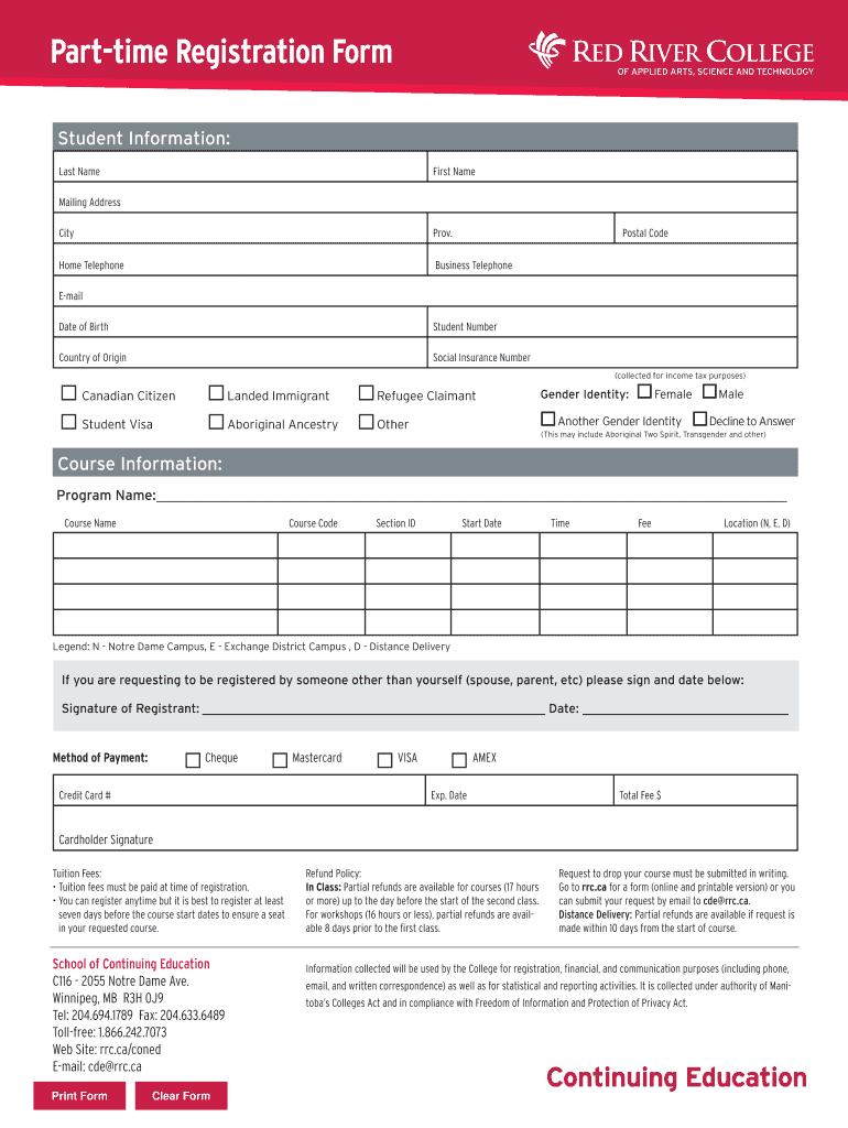 Part-time Registration Form Student Information: Last Name First Name Mailing Address City Prov. Postal Code Home Telephone Business Telephone Email Date of Birth Student Number Country of Origin