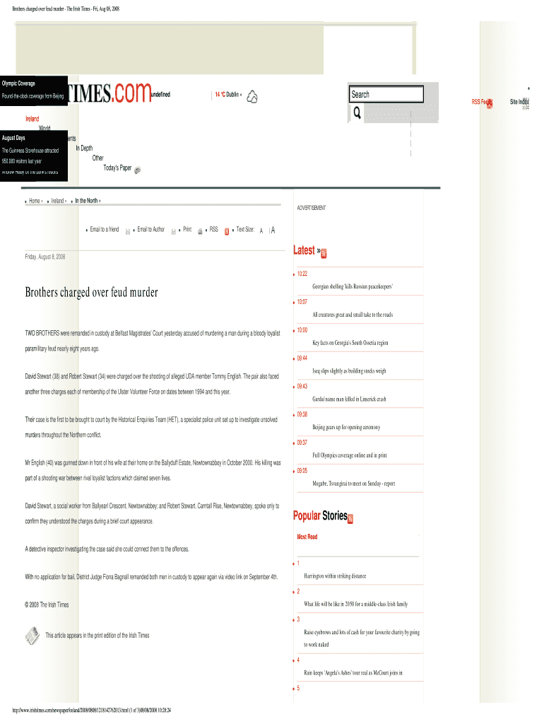 Brothers charged over feud murder The Irish Times Fri, Aug 08, 2008 Olympic Coverage q undefined Roundtheclock coverage from Beijing Search 14 C Dublin Ireland World Supplements In Depth The map Storehouse