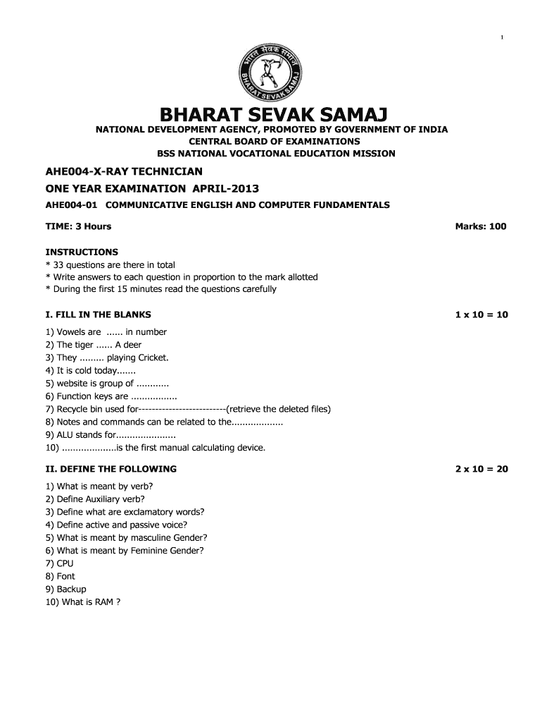 1 BHARAT SEV AK SAMAR NATIONAL DEVELOPMENT AGENCY, PROMOTED BY GOVERNMENT OF INDIA CENTRAL BOARD OF EXAMINATIONS BSS NATIONAL VOCATIONAL EDUCATION MISSION AHE004XRAY TECHNICIAN ONE YEAR EXAMINATION