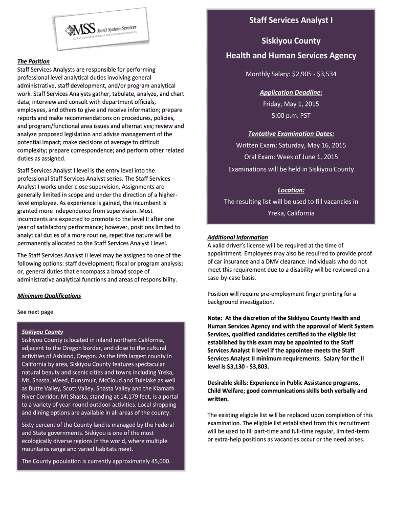 Staff Services Analyst I is required to be filed by individuals applying for or currently working in this position within the civil service system.