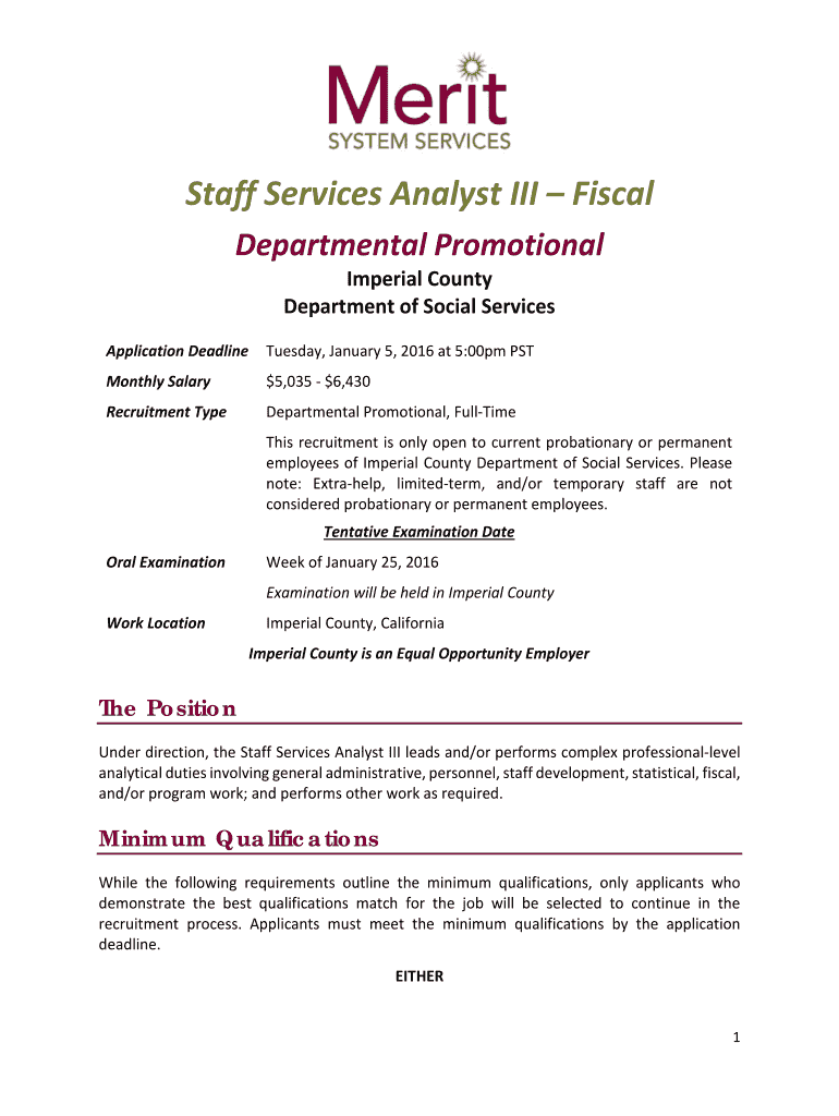 Staff Services Analyst III Fiscal Departmental Promotional Imperial County Department of Social Services Application Deadline Tuesday, January 5, 2016, at 5:00pm PST Monthly Salary $$5,0356,430 Recruitment