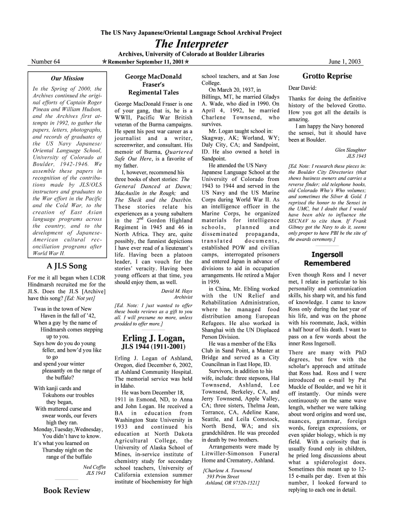 The US Navy Japanese/Oriental Language School Archival Project The Interpreter Archives, University of Colorado at Boulder Libraries Remember September 11, 2001, Number 64 Our Mission In the Spring