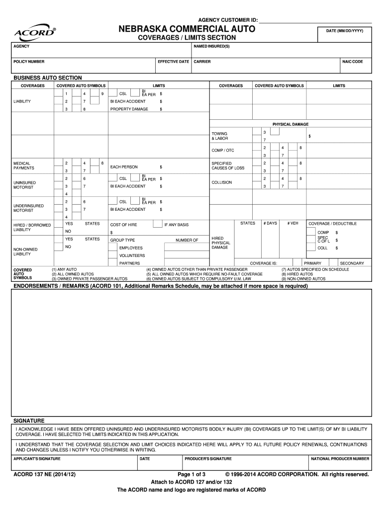 AGENCY CUSTOMER ID: NEBRASKA COMMERCIAL AUTO DATE (MM/DD/YYY) COVERAGES / LIMITS SECTION AGENCY NAMED INSURED(S) POLICY NUMBER EFFECTIVE DATE CARRIER NAIL CODE BUSINESS AUTO SECTION COVERAGES COVERED