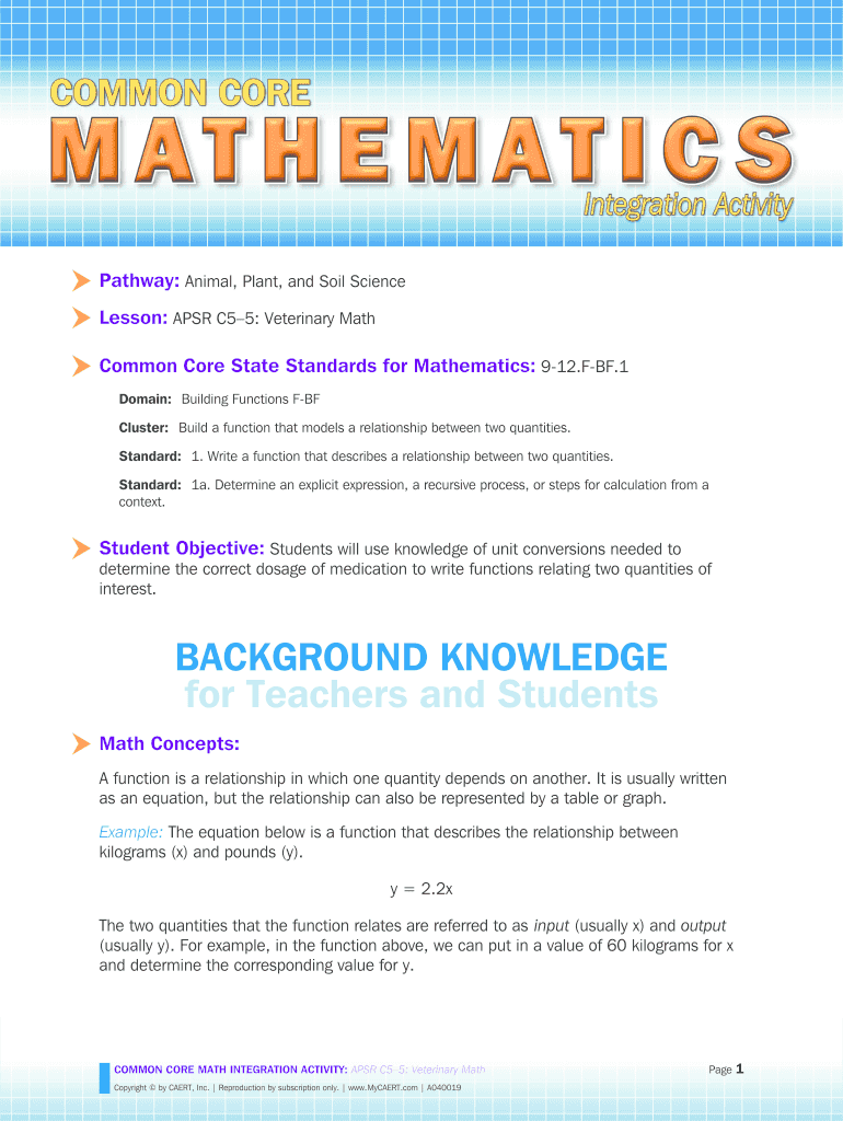Pathway: Animal, Plant, and Soil Science Lesson: APSE C5 5: Veterinary Math Common Core State Standards for Mathematics: 9-12. F-BF.1 Domain: Building Functions F-BF Cluster: Build a function that