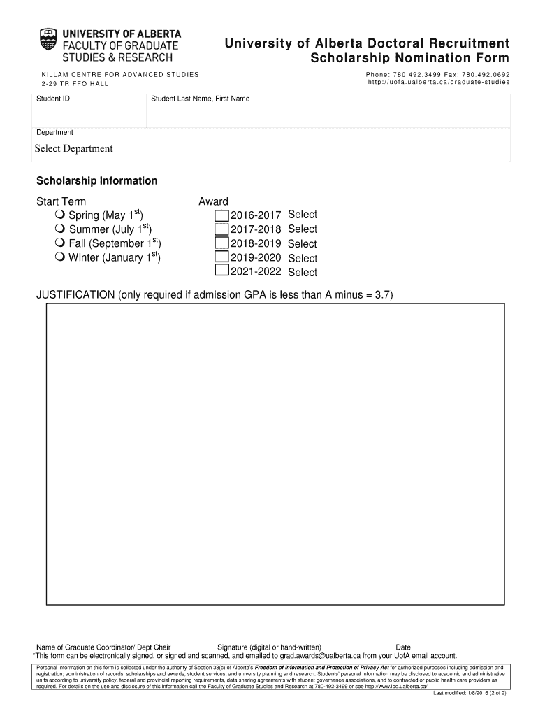 University of Alberta Doctoral Recruitment Scholarship Nomination Form KILL AM Center FOR ADVANCED STUDIES 229 TRI FFO HALL Student ID Phone: 780.492.3499 Fax: 780.492.0692 http://uofa.ualberta.ca/graduatestudies
