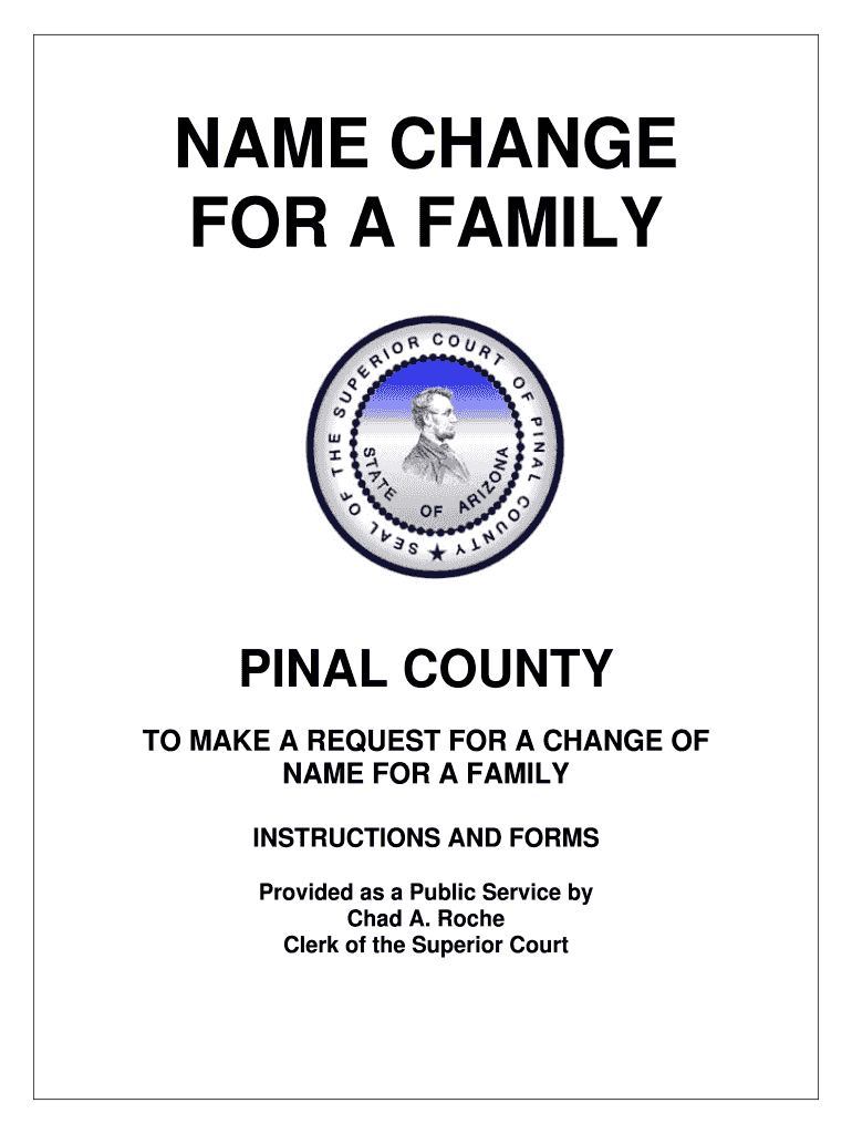 NAME CHANGE FOR A FAMILY PINAL COUNTY TO MAKE A REQUEST FOR A CHANGE OF NAME FOR A FAMILY INSTRUCTIONS AND FORMS Provided as a Public Service by Chad A. Roche Clerk of the Superior Court REQUEST A