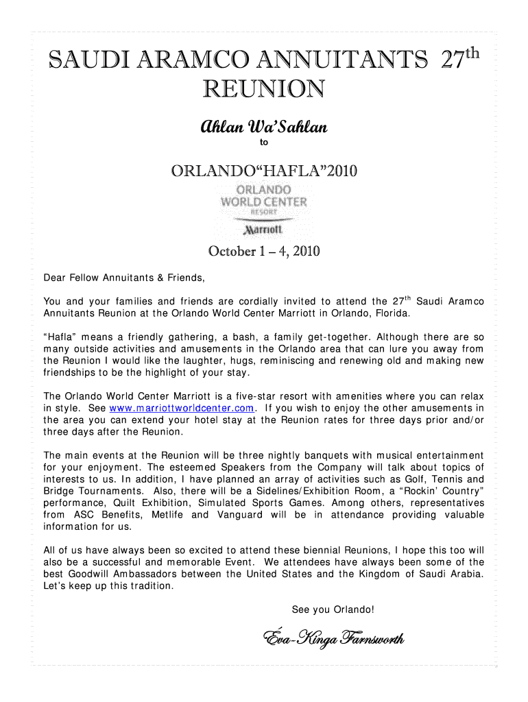 SAUDI ARAMCO ANNUITANTS 27th REUNION Alan Catalan to ORLANDOHAFLA2010 October 1 4, 2010 Dear Fellow Annuitants & Friends, You and your families and friends are cordially invited to attend the 27th