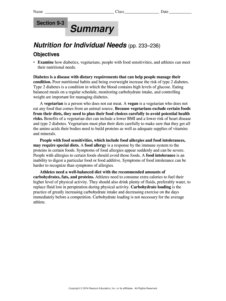 Name Class Date Section 93 Summary Nutrition for Individual Needs (pp. 233236) Objectives Examine how diabetics, vegetarians, people with food sensitivities, and athletes can meet their nutritional
