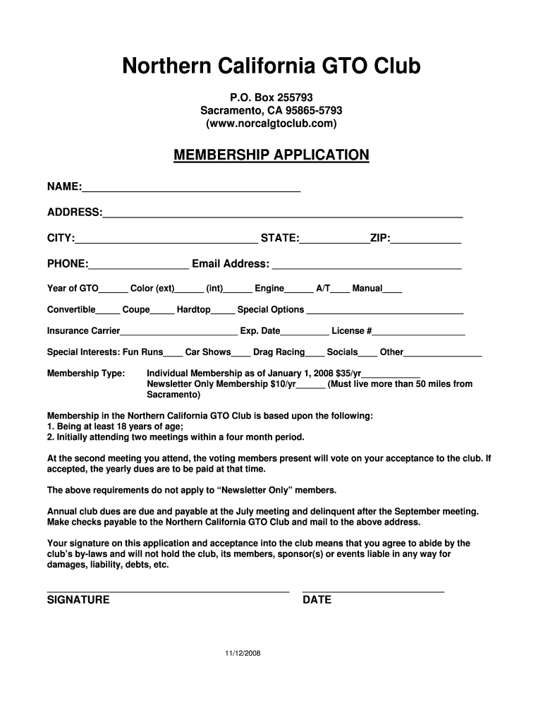 Northern California GTO Club P.O. Box 255793 Sacramento, CA 958655793 (www.norcalgtoclub.com) MEMBERSHIP APPLICATION NAME: ADDRESS: CITY: STATE: ZIP: PHONE: Email Address: Year of GTO Color (ext)