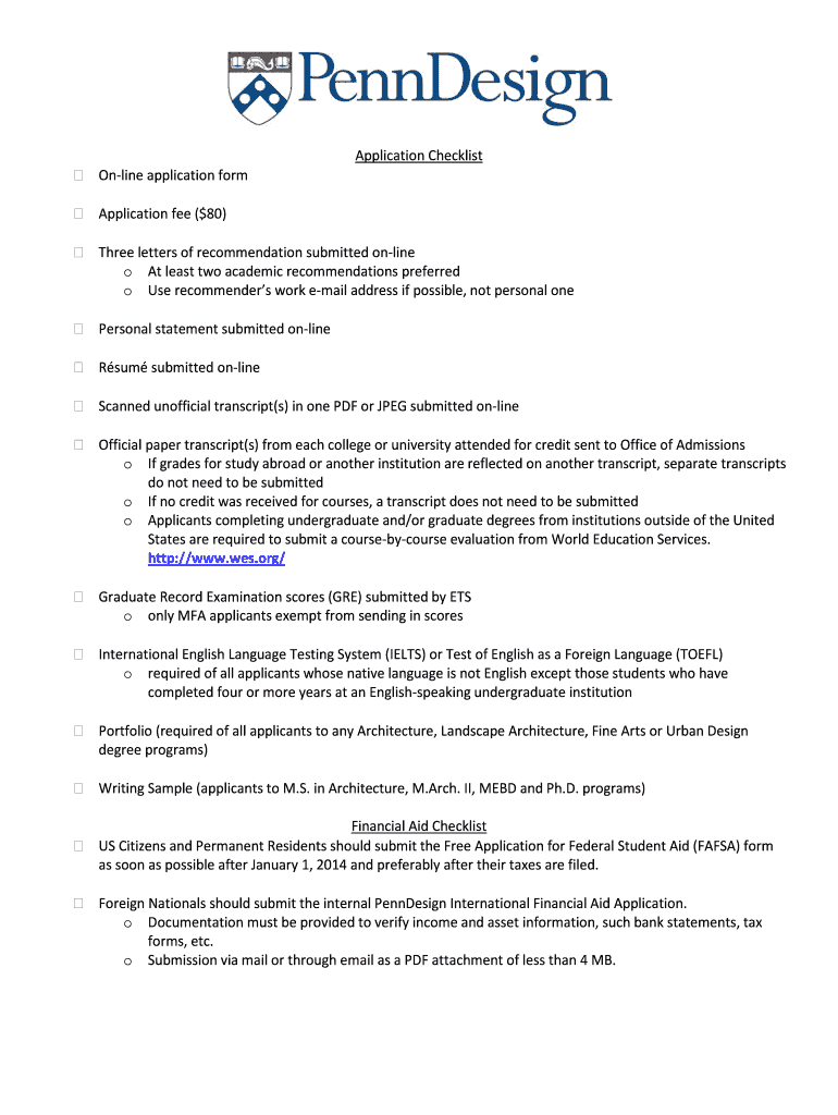 Get the free Application Checklist On-line application form - design upenn