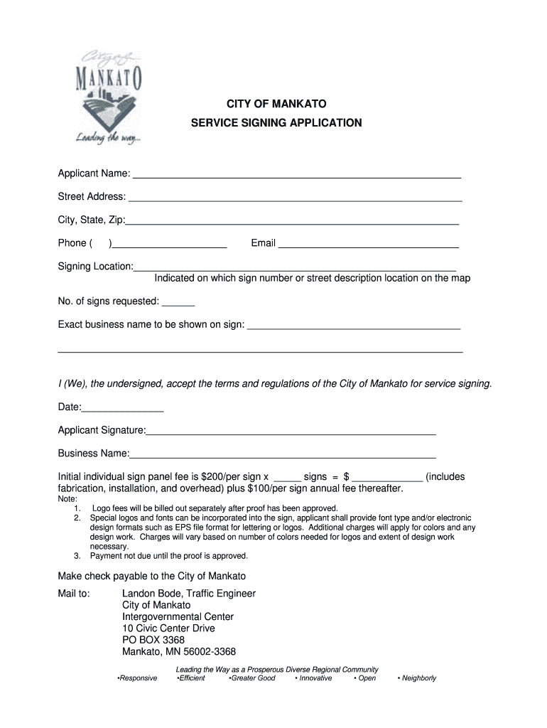 This document outlines the regulations and application process for businesses seeking service signing in the City of Mankato.