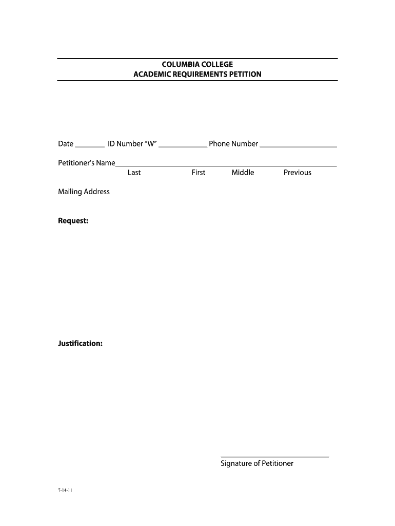 Columbia College ACADEMIC REQUIREMENTS PETITION PROCEDURES FOR PETITION ACTION FIRST STEP: Complete the other side of this petition. a. b. c. Neatly and concisely complete the petition, stating the