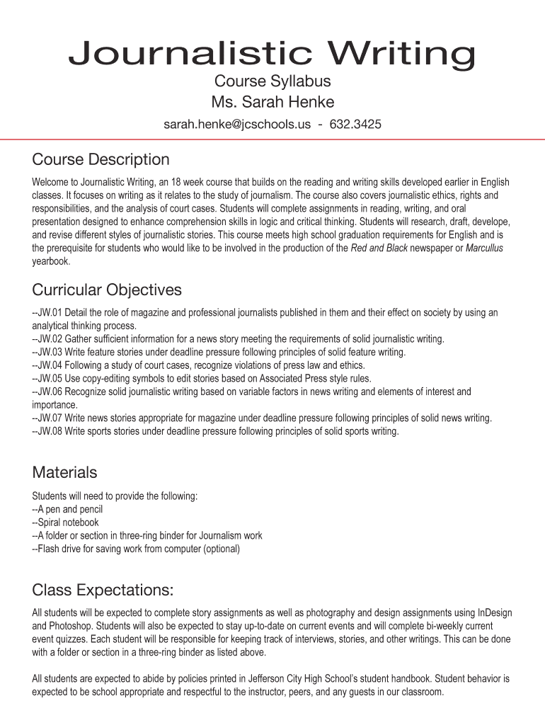 Journalistic Writing Course Syllabus Ms. Sarah Hence Sarah. Hence, schools.us 632.3425 Course Description Welcome to Journalistic Writing, an 18-week course that builds on the reading and writing