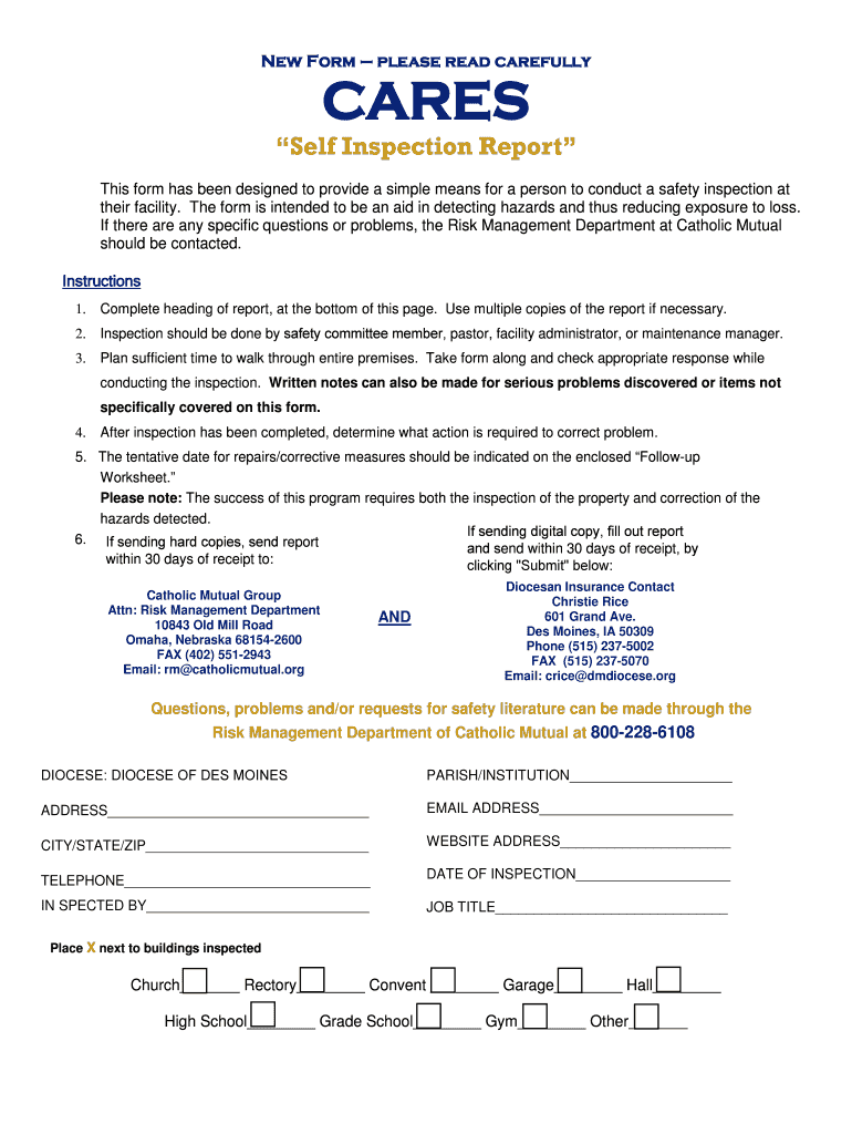 New Form please read carefully CARES Self Inspection Report This form has been designed to provide a simple means for a person to conduct a safety inspection at their facility. The form is intended