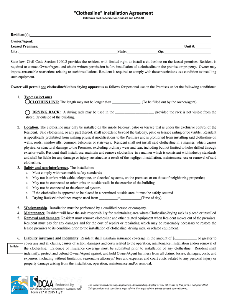 Clothesline Installation Agreement California Civil Code Section 1940.20 and 4750.10 Resident(s): Owner/Agent: Leased Premises: City: Unit #: State: Zip: State law, Civil Code Section 1940.2 provides