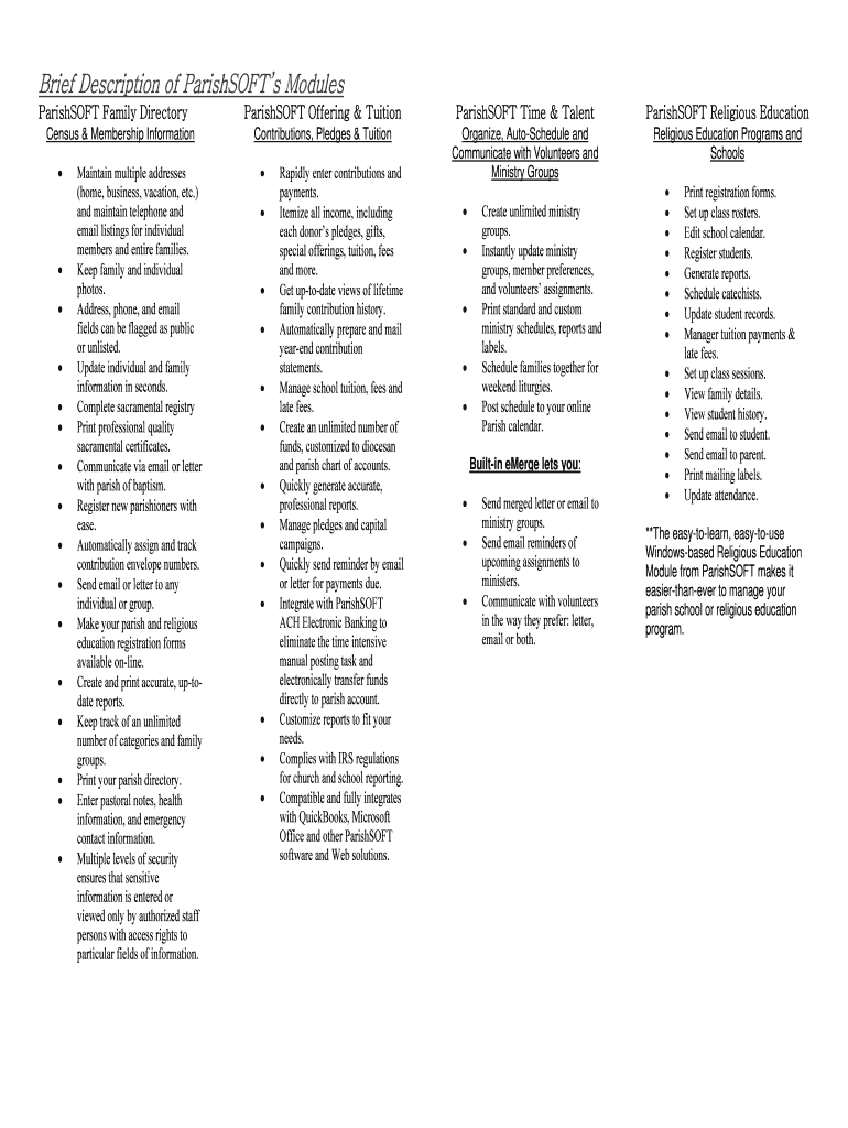 Get the free Brief Description of ParishSOFTs Modules - ecommerce diocese-kcsj