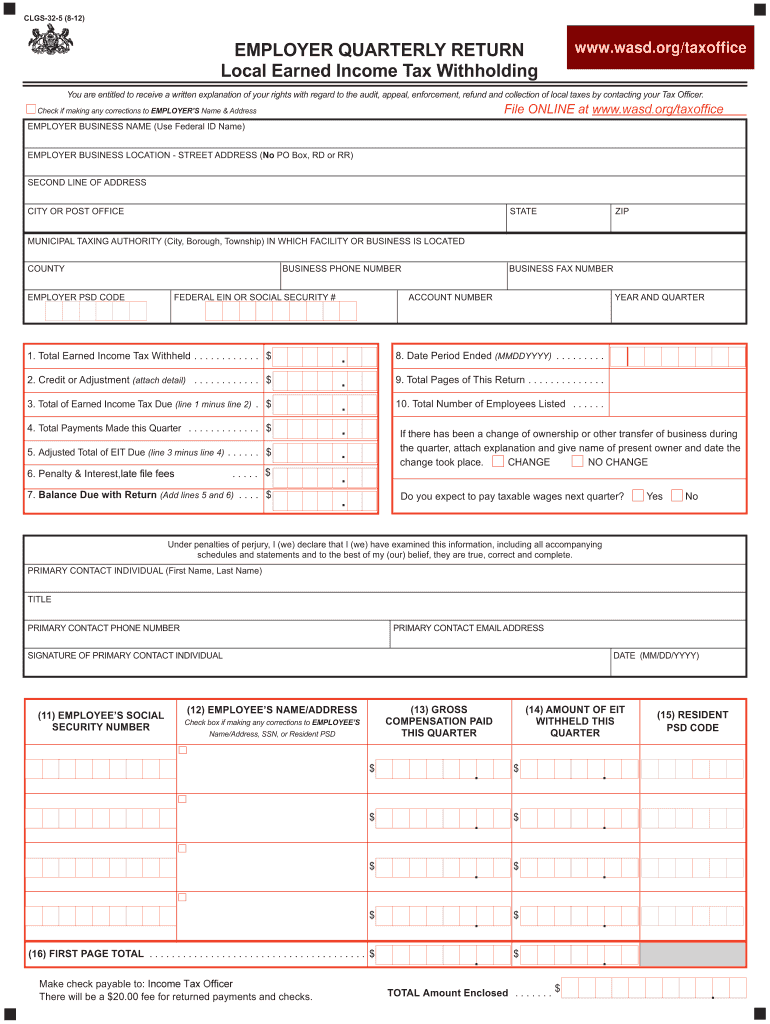 CLGS325 (812) EMPLOYERQUARTERLYRETURN Local Earned Income Tax Withholding Keystone Collections Group POB ox 559 www.wasd.org/taxoffice Irwin, PA 156420559 You are entitled to receive a written explanation
