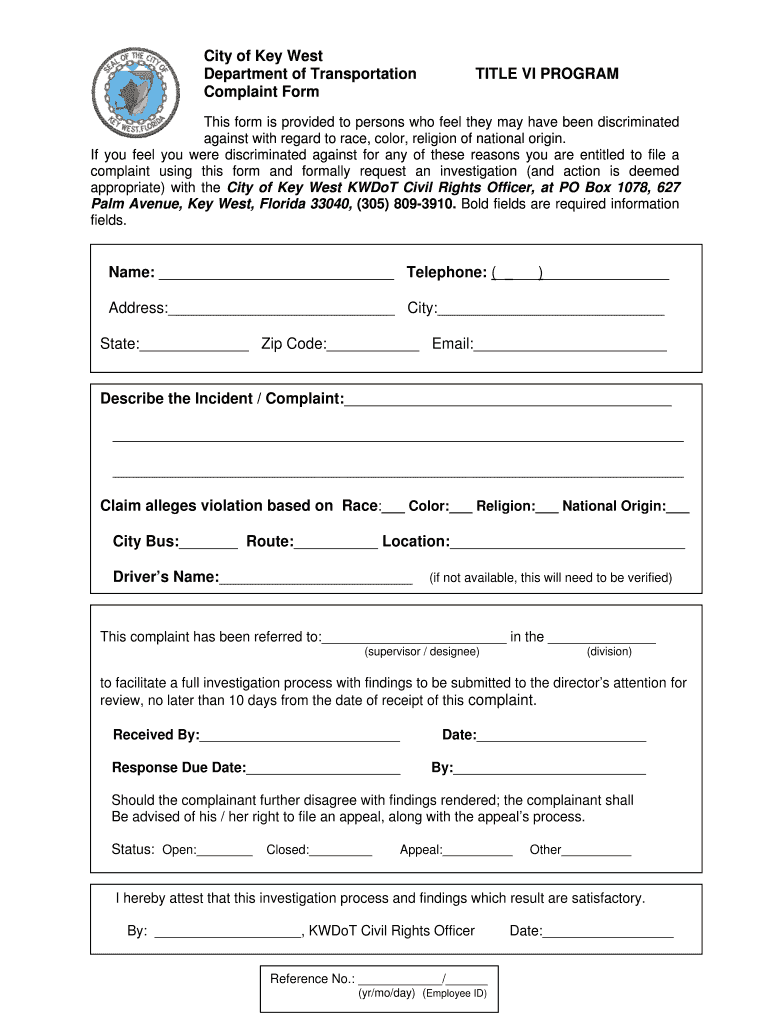 City of Key West Department of Transportation Complaint Form TITLE VI PROGRAM This form is provided to persons who feel they may have been discriminated against with regard to race, color, religion
