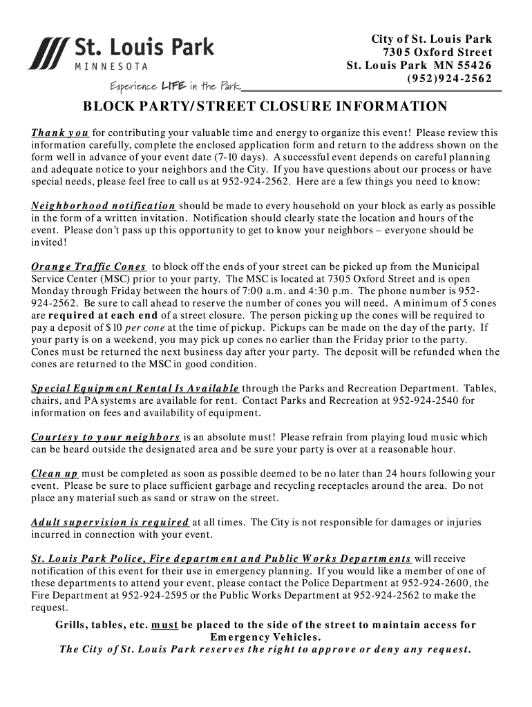Get the free BLOCK PARTY/STREET CLOSURE APPLICATION - stlouispark