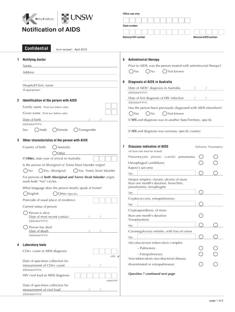 Office use only State number Notification of AIDS National HIV number Confidential 1 National AIDS number form revised : April 2015 Notifying doctor 5 Antiretroviral therapy Names Prior to AIDS, was
