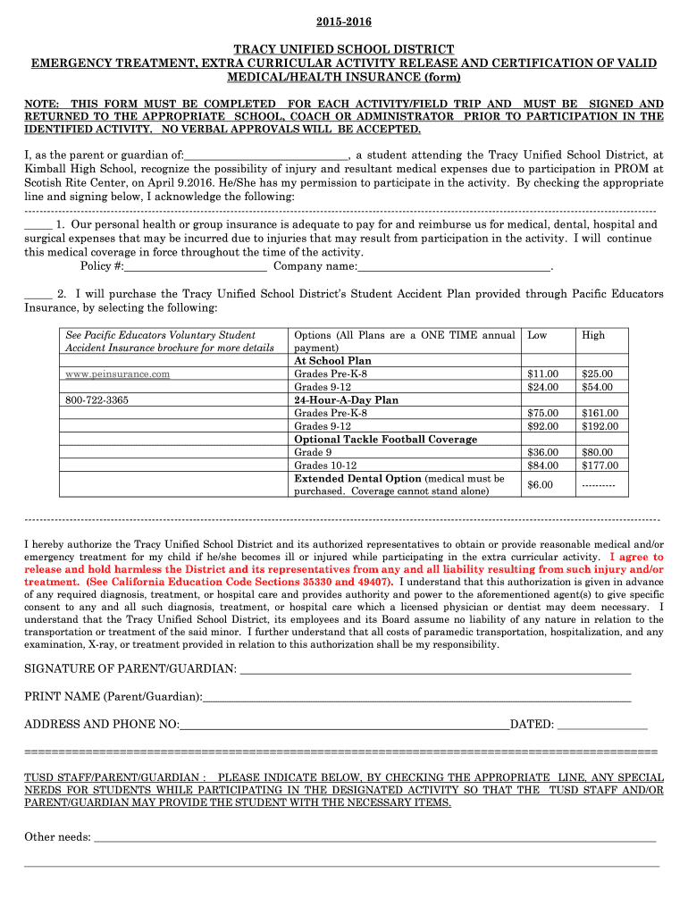 20152016 TRACY UNIFIED SCHOOL DISTRICT EMERGENCY TREATMENT, EXTRA CURRICULAR ACTIVITY RELEASE AND CERTIFICATION OF VALID MEDICAL/HEALTH INSURANCE (form) NOTE: THIS FORM MUST BE COMPLETED FOR EACH