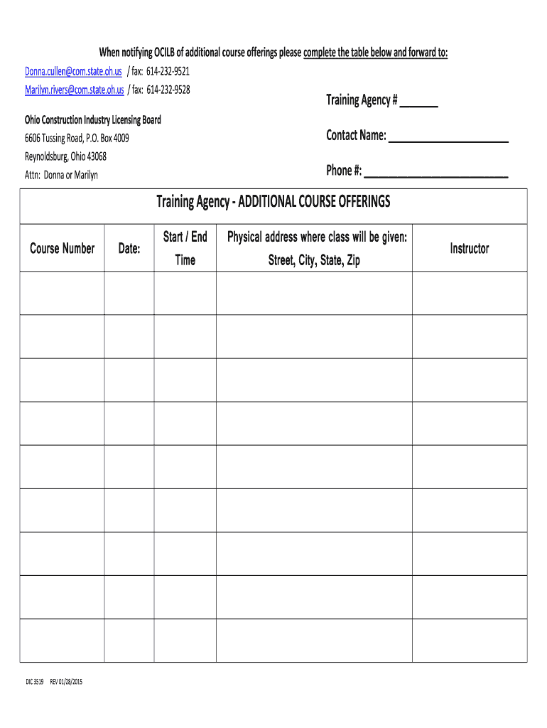 DIC 3519 REV 01/28/2015 When notifying OIL of additional course offerings please complete the table below and forward to: Donna.cullen@com.state.oh.us / fax ...