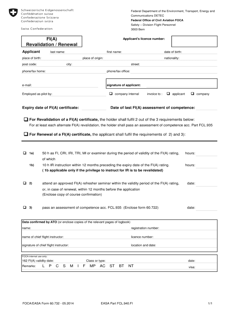 Federal Department of the Environment, Transport, Energy and Communications DETECT Federal Office of Civil Aviation FOCAL Safety Division Flight Personnel 3003 Bern FI(A) Revalidation / Renewal Applicant's