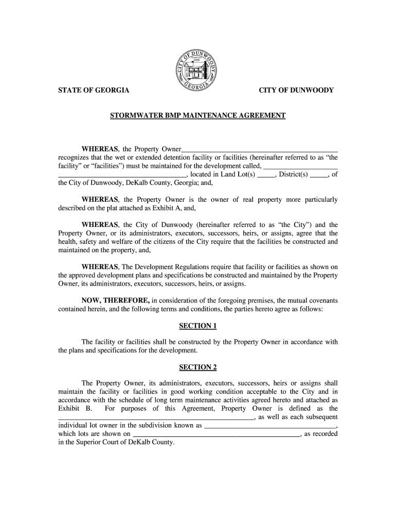 STATE OF GEORGIA CITY OF DUNWOODY STORMWATER BMP MAINTENANCE AGREEMENT WHEREAS, the Property Owner recognizes that the wet or extended detention facility or facilities (hereinafter referred to as