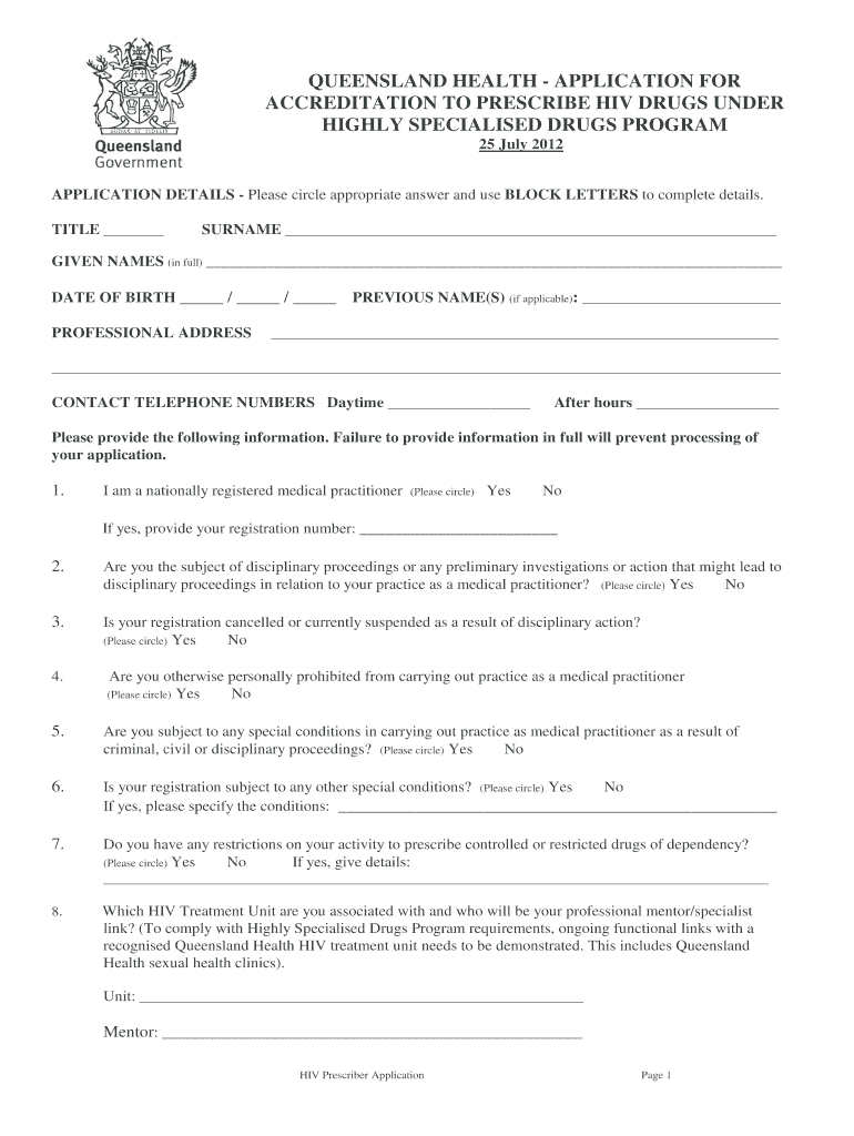QUEENSLAND HEALTH APPLICATION FOR ACCREDITATION TO PRESCRIBE HIV DRUGS UNDER HIGHLY Specialized DRUGS PROGRAM 25 July 2012 APPLICATION DETAILS Please circle appropriate answer and use BLOCK LETTERS