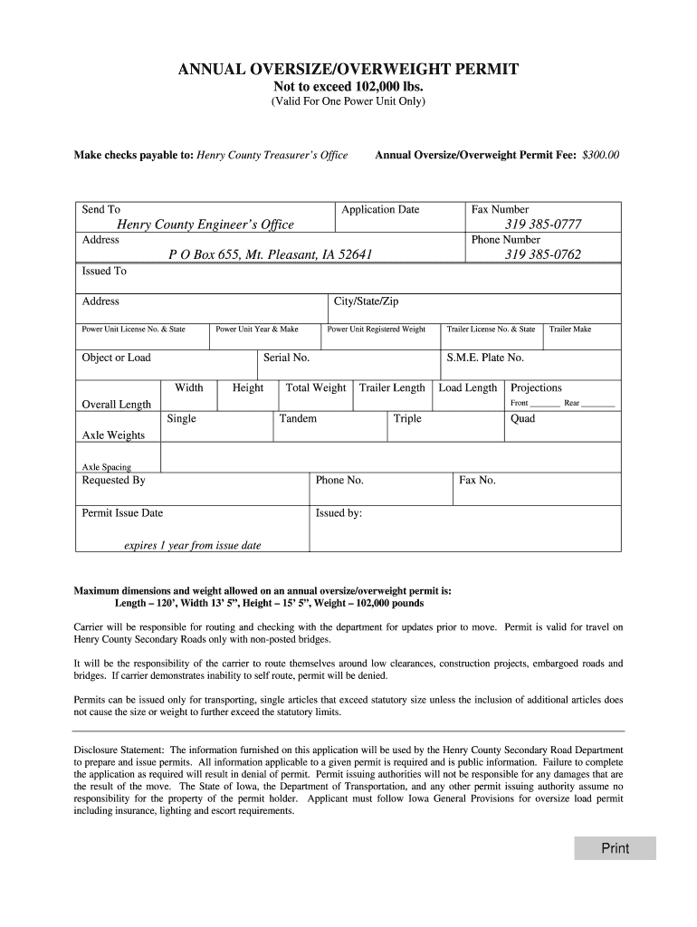 ANNUAL OVERSIZE/OVERWEIGHT PERMIT Not to exceed 102,000 lbs. (Valid For One Power Unit Only) Make checks payable to: Henry County Treasurers Office Sends To Annual Oversize/Overweight Permit Fee: