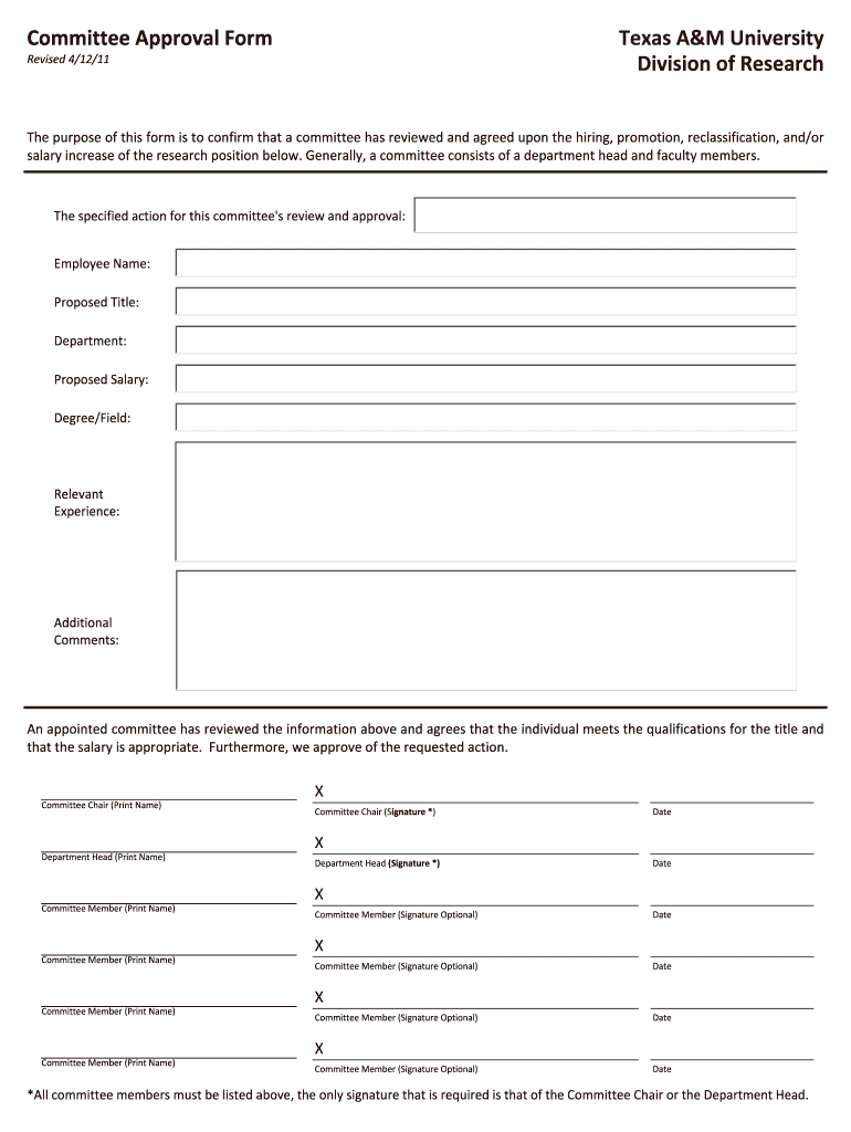 Committee Approval Form Texas A&M University Division of Research Revised 4/12/11 The purpose of this form is to confirm that a committee has reviewed and agreed upon the hiring, promotion, reclassification,