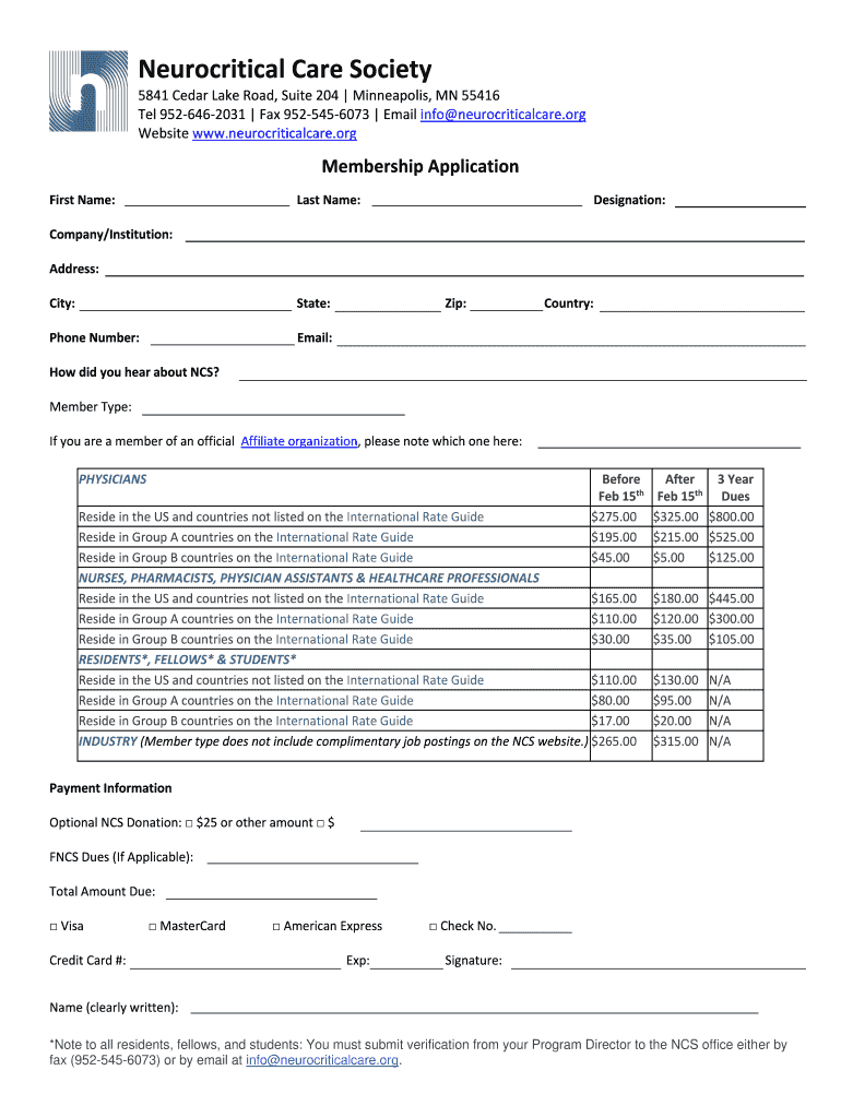 Neurocritical Care Society 5841 Cedar Lake Road, Suite 204 Minneapolis, MN 55416 Tel 9526462031 Fax 9525456073 Email info neurocriticalcare.org Website www.neurocriticalcare.org Membership Application