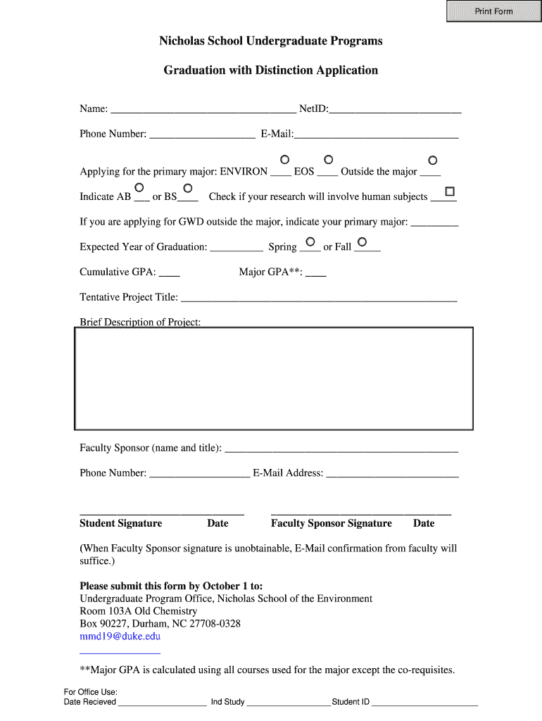 Print Form Nicholas School Undergraduate Programs Graduation with Distinction Application Name: Fetid: Phone Number: Email: Applying for the primary major: ENVIRON EOS Outside the major Indicate AB