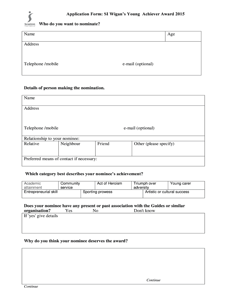 Application Form: SI Wigans Young Achiever Award 2015 Who do you want to nominate? Name Age Address Telephone /mobile email (optional) Details of person making the nomination. Name Address Telephone