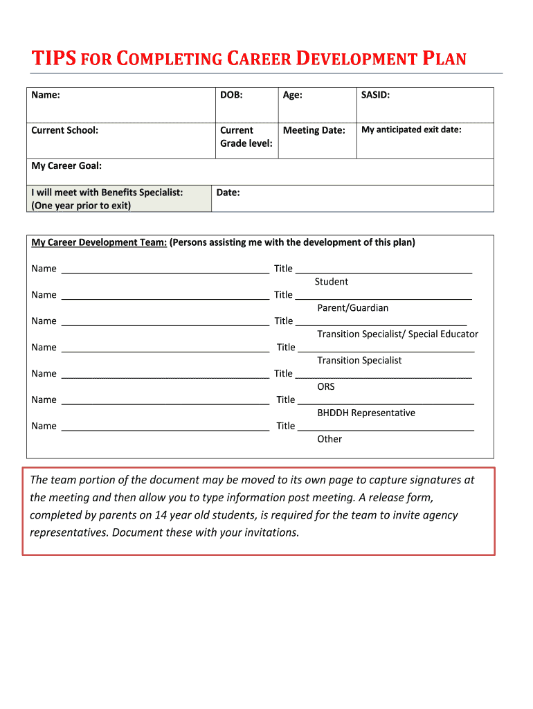 TIPS FOR COMPLETING CAREER DEVELOPMENT PLAN Name: DOB: Age: SAID: Current School: Current Grade level: Meeting Date: My anticipated exit date: My Career Goal: I will meet with Benefits Specialist: