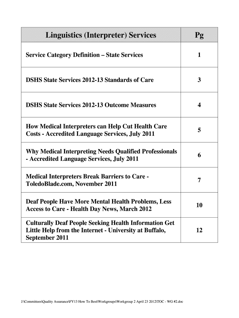 Linguistics (Interpreter) Services Pg Service Category Definition State Services 1 DSS State Services 201213 Standards of Care 3 DSS State Services 201213 Outcome Measures 4 How Medical Interpreters