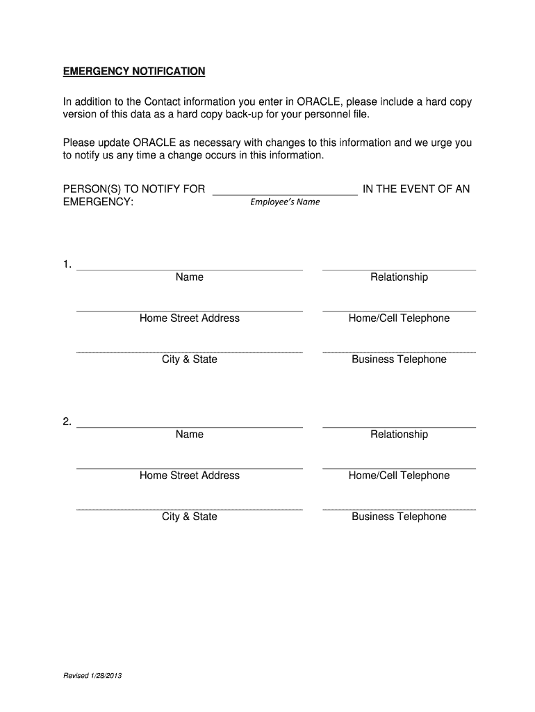 RESET FORM PRINT FORM EMERGENCY NOTIFICATION In addition to the Contact information you enter in ORACLE, please include a hard copy version of this data as a hard copy backup for your personnel file.