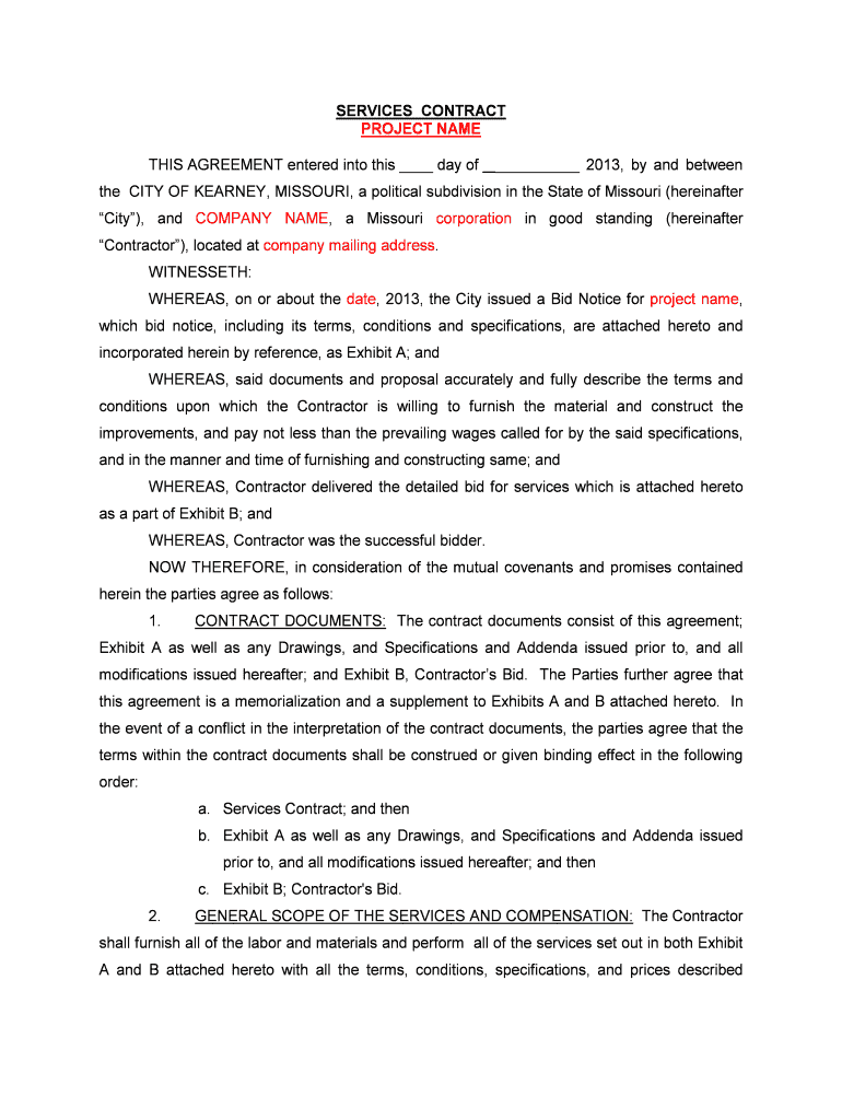 This document is a services contract between the City of Kearney, Missouri, and a contractor for the provision of services and materials for a specific project.