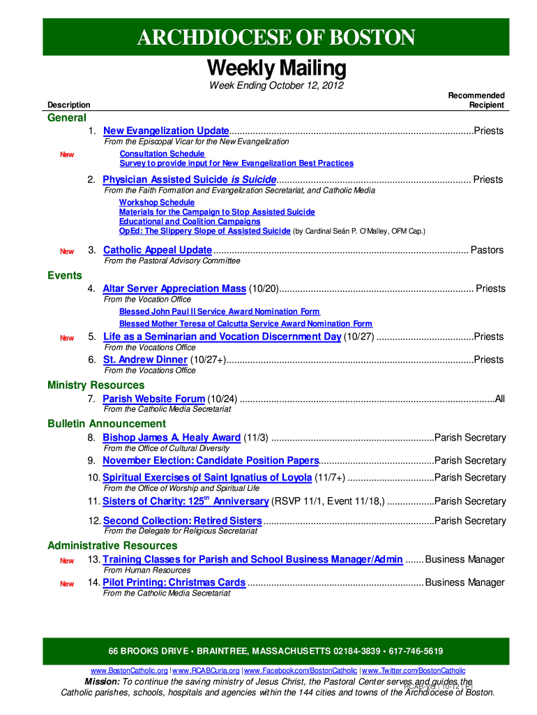 ARCHDIOCESE OF BOSTON Weekly Mailing Week Ending October 12, 2012, Recommended Recipient Description General 1. New Evangelization Update.............................................................................................