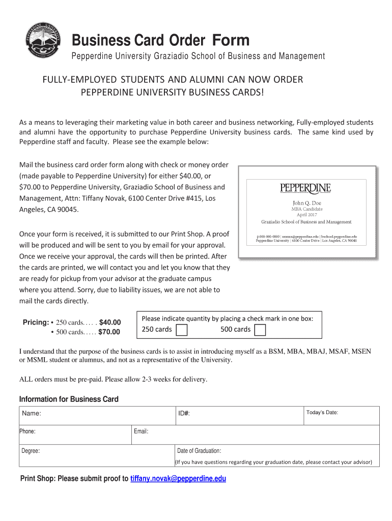 Business Card Order Form Pepper dine University Graciano School of Business and Management FULLYEMPLOYED STUDENTS AND ALUMNI CAN NOW ORDER PEPPERMINT UNIVERSITY BUSINESS CARDS! As a means to leveraging